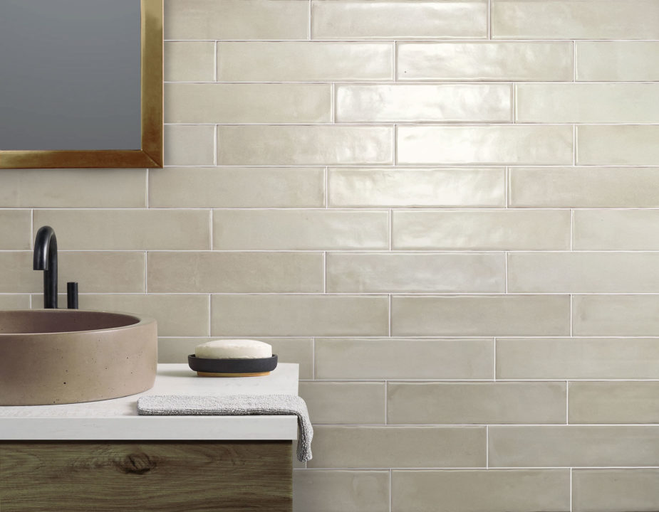 Beige bathroom interior with double sink and mirror, carpet on hardwood floor. Bathing accessories and window in hotel studio. 3D rendering